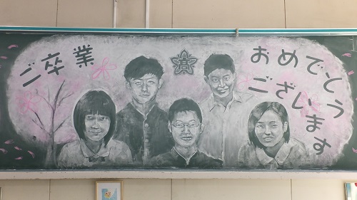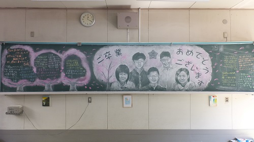 毎年、卒業する3年生に対し、後輩たちからVTRを作ったり感謝の手紙を書いたりしていますが、今年は黒板アートに挑戦しました。美術科の保健委員1年生原崎くん、宮津さんを中心に2年生も少し手伝ってくれました。