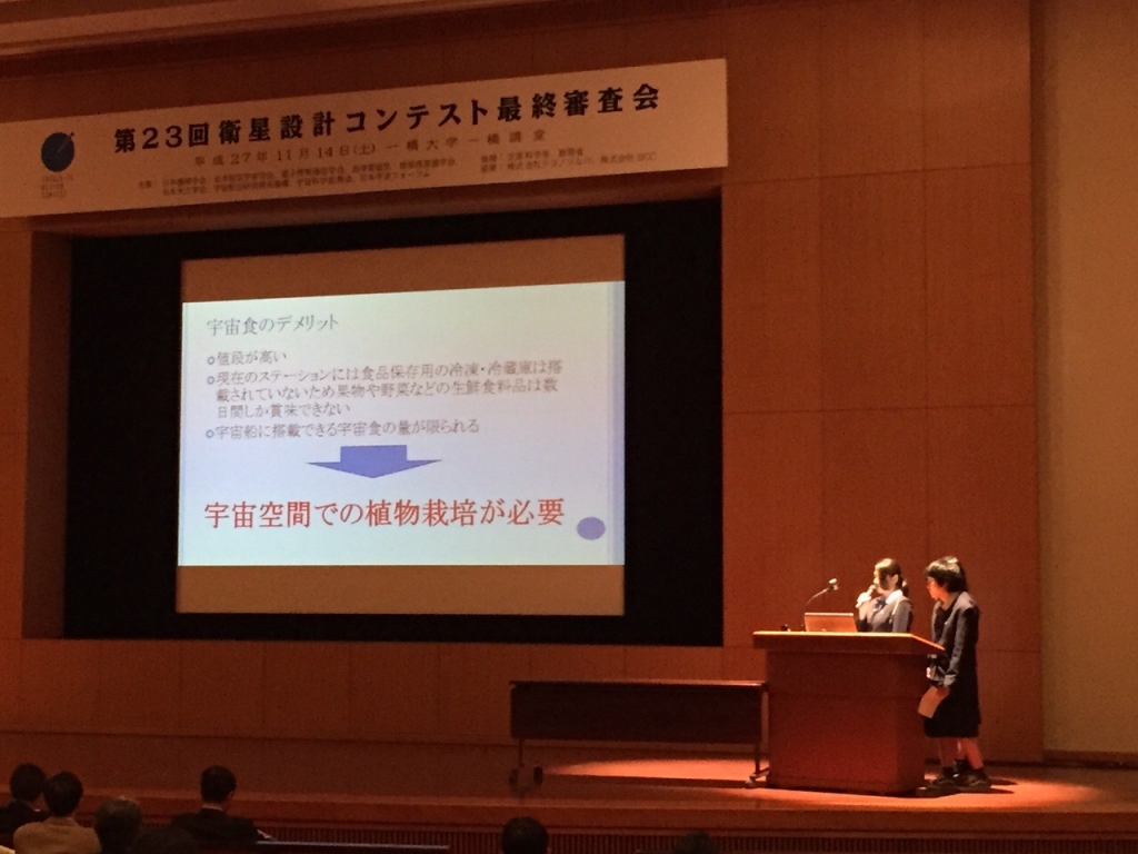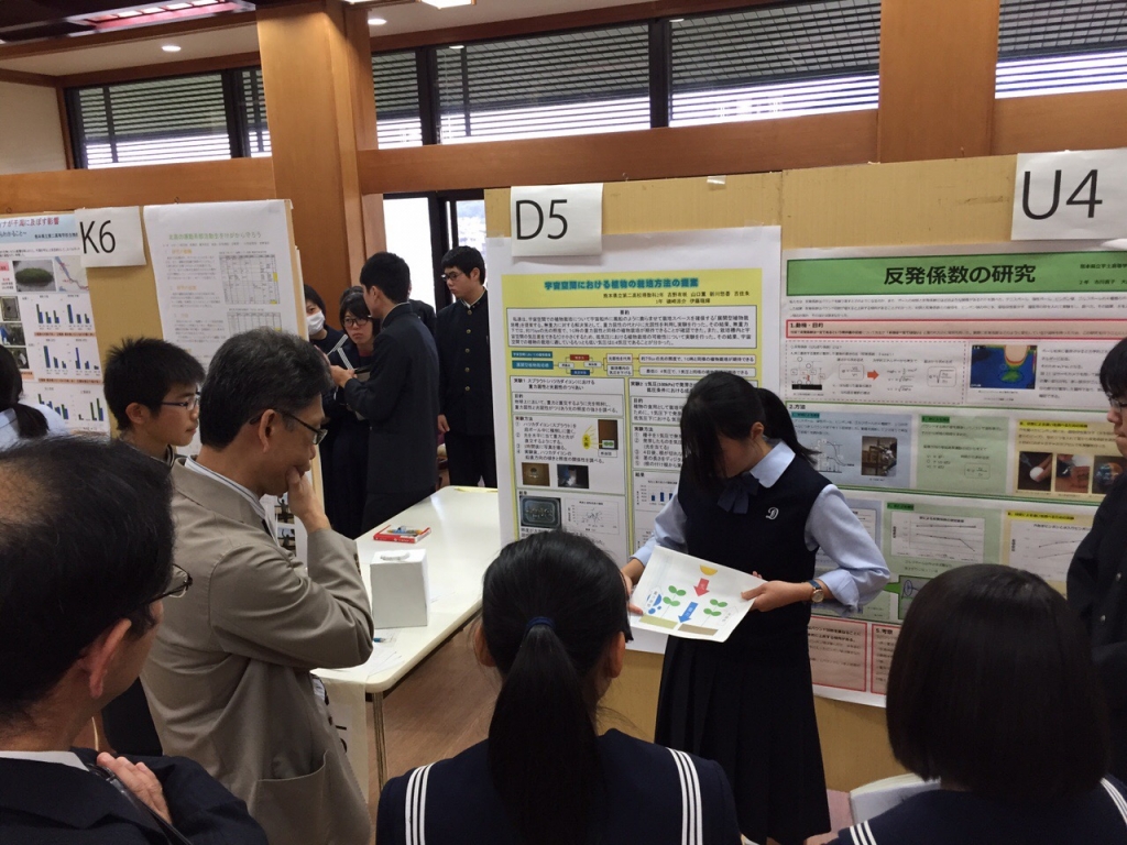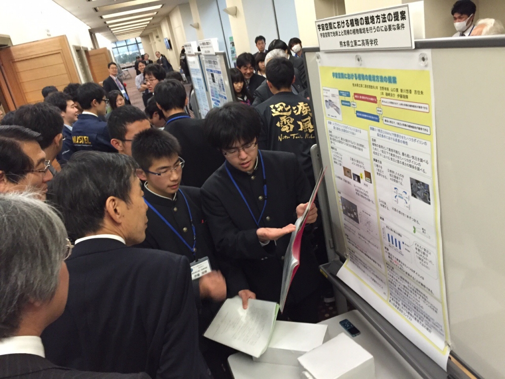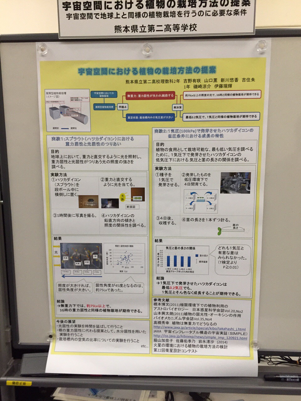 内容は、課題研究で取り組んでいる「宇宙空間における植物の栽培方法の提案」という研究です。宇宙ステーションなどで食用の植物を栽培するための基礎研究を行いました。