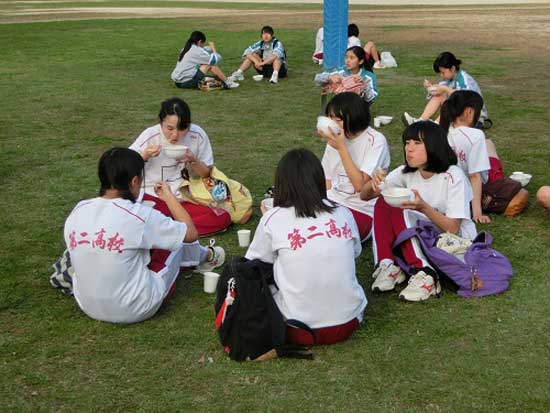 30km完歩後に豚汁を頬張る3年生