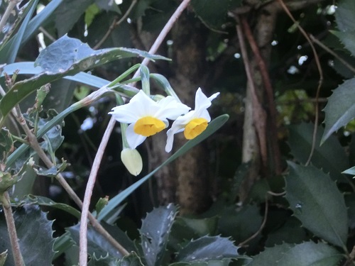 生物室前の雪は、昼過ぎにはほとんど姿を消しました。そんな中、雪の中で寒さに耐えながら力強く息づいている植物を見つけました。スイセンとツバキです。