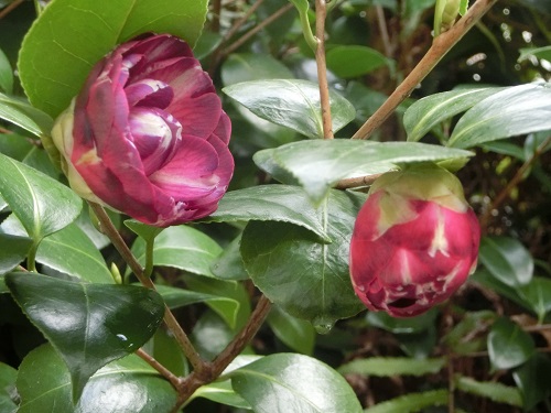 スイセンは暖冬からか、昨年末に咲き始めましたが、この雪の中でも美しい姿を見せていました。また、開花間近のツバキは、濃い赤色の花びらを今にも広げようとしていました。寒い冬にも植物は力強く生きています。