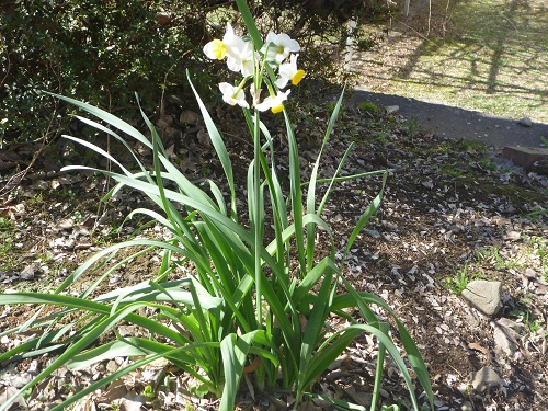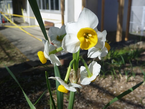 先日、お伝えしたように第二高校の校庭にはたくさんの花を見つけることができます。今日は、校舎の片隅でひっそり咲いたスイセンを見つけました。