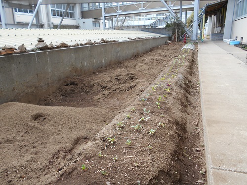 生物室前の花壇は、ヒイラギモクセイが太陽を遮って日当たりがよくありません。そこで、今回ヒイラギモクセイを取り除くことにしました。おかげで日当たりもよくなり、以前植えた春野菜も勢いよく成長するようになりました。現在、アブラムシで頭を悩ませています。
