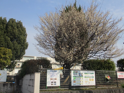 開花を始めた校庭のウメ