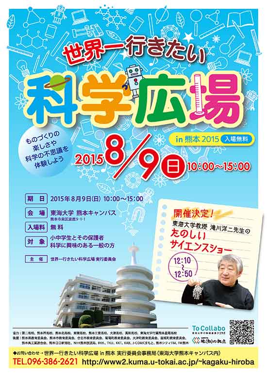 東海大学・熊本キャンパスで開催された「世界一行きたい科学広場 in 熊本 2015」に出展団体として参加しました。出展ブース名は「AR(拡張現実)を体験しよう!」で、東海大学電気電子情報工学科感性情報処理研究室が研究しているARシステムに、コンピュータ同好会の生徒が作成した3DCG(3次元コンピュータグラフィックス)を組み込み、タブレットコンピュータで体験してもらうという企画です。