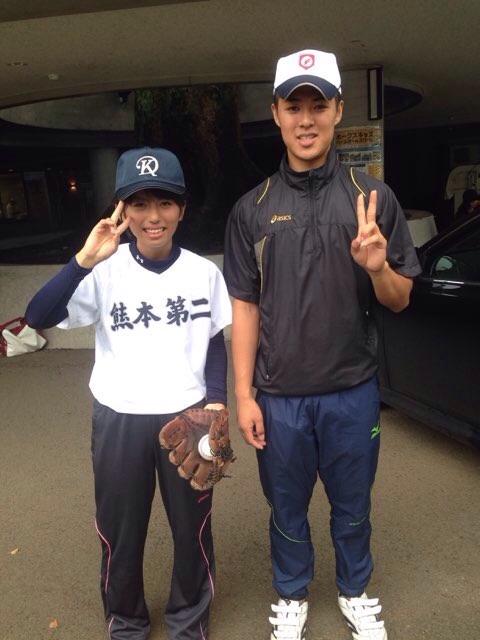 写真の2人は、第1試合始球式の稲岡くん(熊本県立盲学校3年)と第2試合始球式の酒井さん。稲岡くんは昨年、第二高校で一緒に模試を受けて以来、酒井さんとも交流があるそうです。