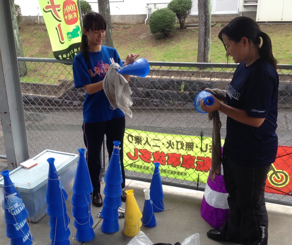 マネージャーはサッカー部に借りたメガホンを綺麗に拭いています。