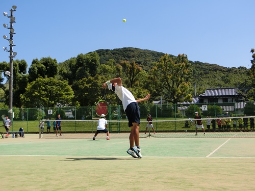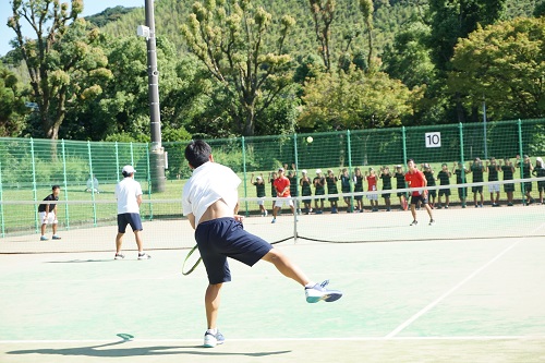 初戦の天草工業高校は、3年生の意気込みと2年生の勢いで、3-0と完勝しました。次は優勝候補のマリスト学園高校です。一か八かの作戦で臨みましたが、シングルスの実力差が予想以上に大きく、惜しくも敗れてしましました。結局、マリスト学園高校は優勝しましたが、対戦した2年生は今後につながる試合になったと思います。