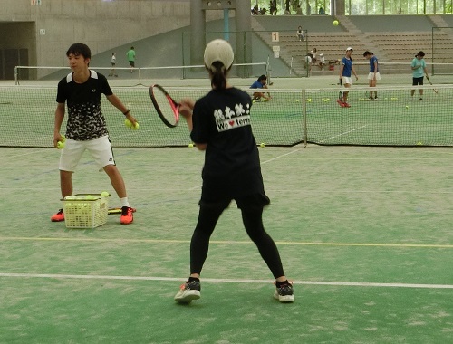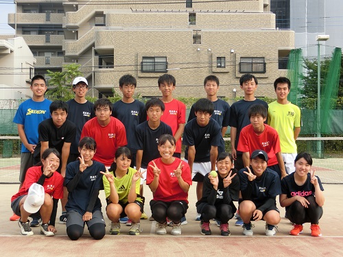 夏休みに入り、1週間が過ぎました。27日は午後から県立大学で男女合同の練習を3時間みっちり行いました。この日の目標はダブルスの強化で、ボレーやスマッシュといったネットプレーの基本練習の後、雁行陣を基本とした実践練習を行いました。特に女子は攻撃的なプレーを練習の中で意識し、ベースラインの中で踏み込んだ強いストロークやセンターを中心にポーチに出るボレーの練習を行いました。また、ボレーされたボールのリカバリーショットなど今日は少しレベルの高い練習にチャレンジしました。練習後半の実践練習では、その成果が少し見られました。
