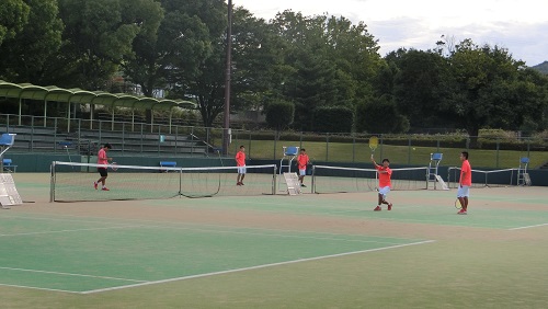 15日の夕方から東稜高校と大津高校の3校で練習試合を行いました。日中は35℃を超える暑さで、熊本市は6日連続の猛暑日です。試合開始は16時でしたが、それでもテニスコートは30℃以上の温度でした。