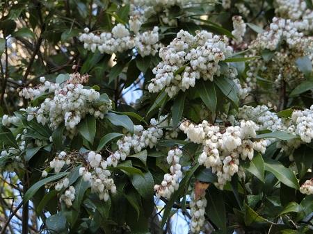 第二高校バス停の横にアセビの花が満開です。枝先に10cm程度の花序を垂らし、多くの白いつぼ状の花を咲かせています。一見地味ですが、一つ一つの花を観察すると10本のおしべなどを確認することができます。