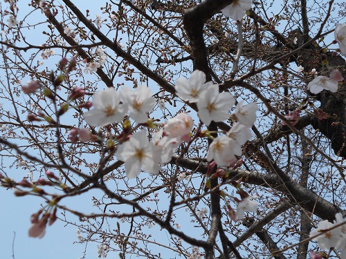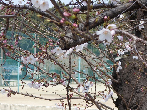 テニスコートの脇には桜の木があります。例年、春休みになると開花していましたが、今年は3月に入っても肌寒く、開花が遅れているようです。今日は少しだけ開花した桜の花を見つけました。