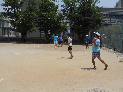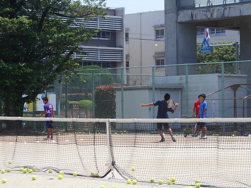 29日は、1年生はランニングなど基礎トレーニングの後、約2時間ストロークやサーブの基本練習に汗を流しました。日中は夏を思わせる日差しで、Tシャツも汗だくになりました。
