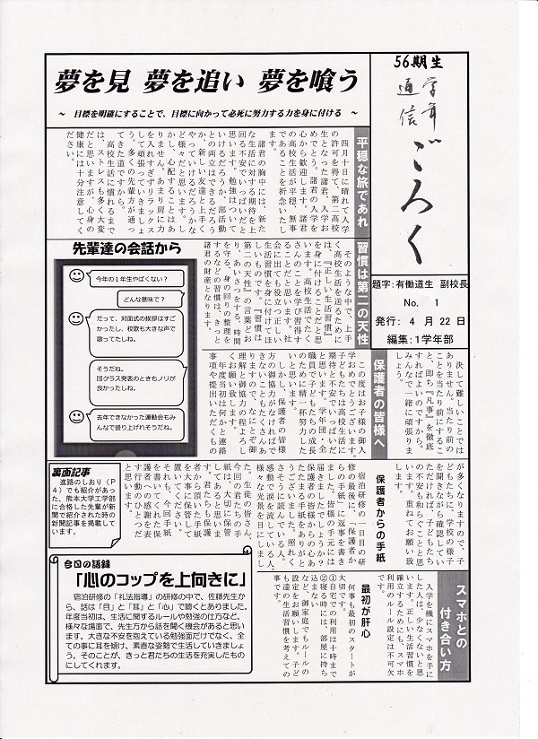 56期生である1学年の学年通信、その名も「ごろく」。題字は副校長先生です。先日のPTA総会で保護者の皆さんにお配りしました。