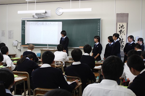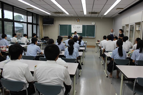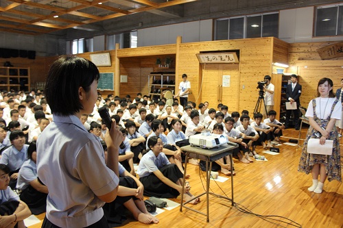 講演中の生徒たちの様子は、目がキラキラして話に引き込まれているようでした。最後に「自分にも何かできそうだと思った人!」と問いかけましたら、ほとんど全員が手をあげてくれました。一時間の講演でこんなに人は成長するのですね。
