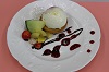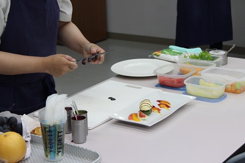 まずはお手本、プロは果物のカットから手つきが違います。さりげない動作に生徒たちはどよめいていました。