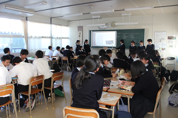 今回の発表会はA3用紙に記入したものを実物投影機で拡大しています。ICTの活用も第二高校の研究テーマです。