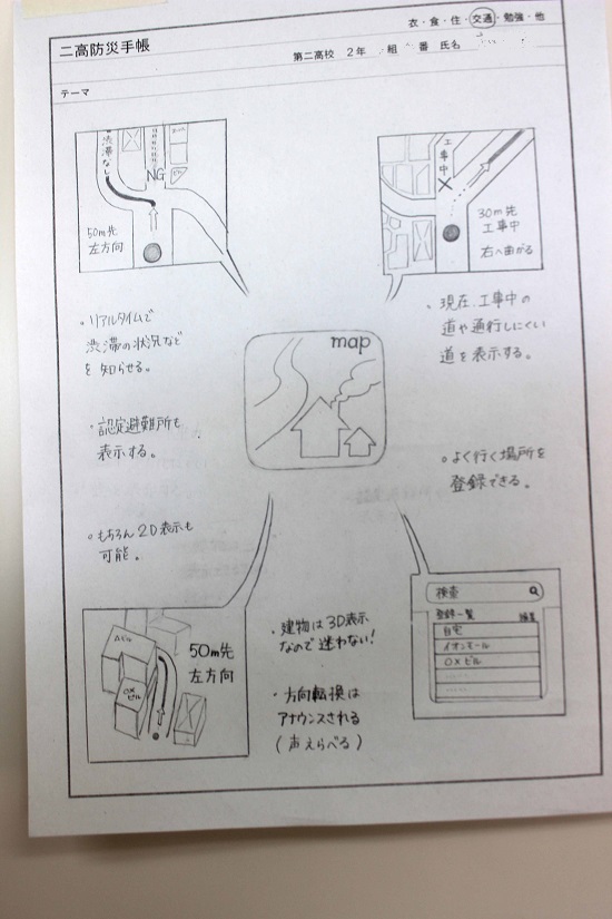 「二高防災手帳」の制作です。第一部は地震を振り返ってのエッセイ、第二部は災害時にできるだけ快適に過ごすためのアイデア、または過去の自分へのアドバイスを企画書風にまとめる。第三部は実際にプロトタイプを制作します。この「二高防災手帳」は雑誌風にまとめて印刷し、美術選択の生徒たちで共有する予定です。