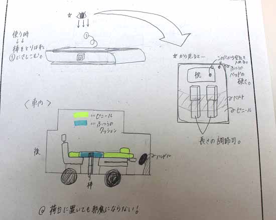 美術Ⅰ振り返りの中で、震災について考える項目をつくりました。どんなアイテム、デザインがあるとよかったかという質問で「荷物を運ぶカート」、「トイレをきれいに使うアイコン」「水を運ぶときに使いやすい取っ手」「グルメテーブルかけ」「体育館や車の中で使える寝具」などが出ました。