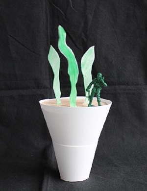 上のカップが浄水器になっています。震災後すぐ、援助が来るまでの長くとも三日間をしのぐ為に、一番必要な清潔な水をコップ一杯でもあれば・・・という体験に基づくコンセプトです。常にそばにあっても気にならないデザイン性がポイントです。