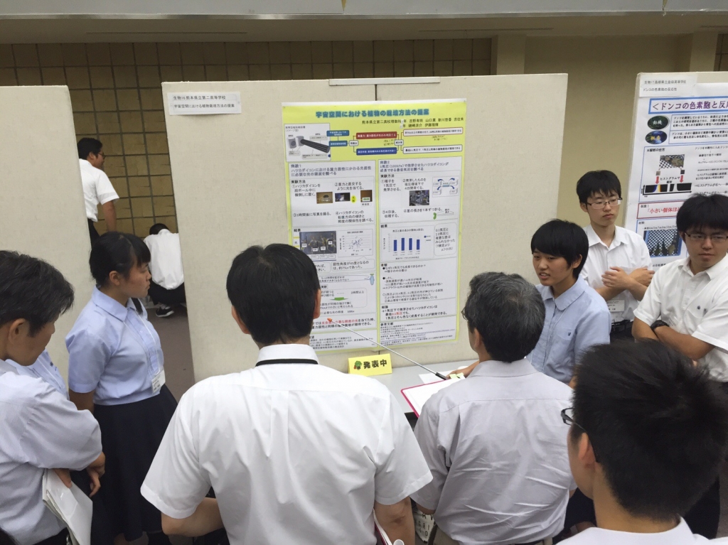 理数科3年生の宇宙工学班、環境班の8名で参加しました。中国・四国・九州地区の各県から約60テーマが集まってのポスター発表会で、自分たちの研究についていろいろな人と意見交換し、他の発表を聞き、たくさんの刺激をもらうことができました。