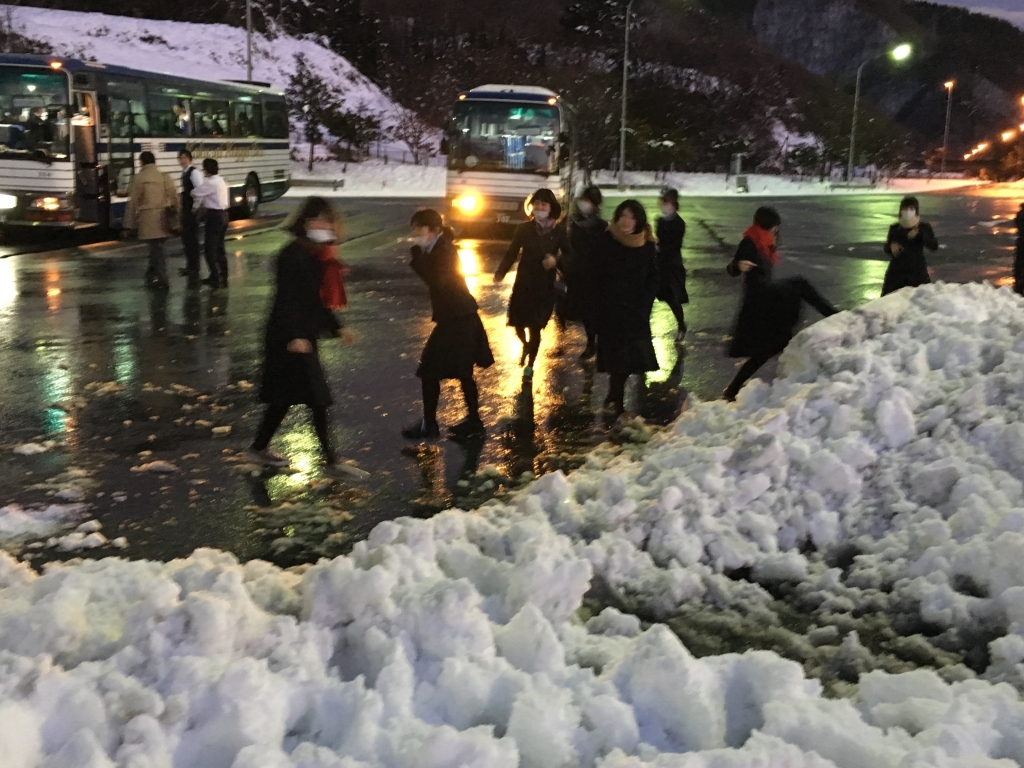 予定ではもうホテルに到着しているはずですが、渋滞等もあり現在まだ高速です。生徒達も疲れているかと思いきや、休憩の高速インターでは雪にダイブしたり、合戦が始まったり、と元気な様子を見せてくれます。