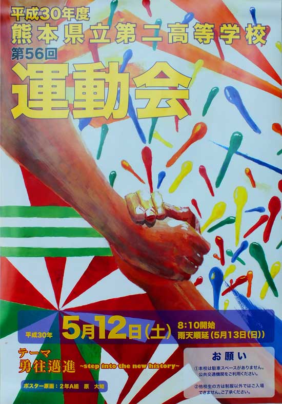 今年のテーマは「勇往邁進~step into the new history~」です。今年は昨年まであった紫団の代わりに青団ができ、また、1・2年製の学年競技が変わりました。この第56回の運動会で、今までに先輩方が創り上げてこられた第二高校の伝統を受け継ぎつつ、新たな歴史の一ページを刻みましょう。