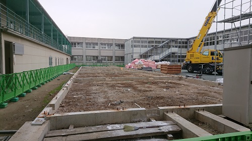 1月7日から、仮設校舎としてハンドボールコートに建設されていたプレハブの撤去工事が始まっています。熊本地震後、主に1年生の教室として使用し、その後、図書閲覧室や進路資料室として活用しました。3月末までには仮設管理棟として使用したプレハブも撤去され、ハンドボールコートへの復元工事が始まります。