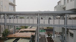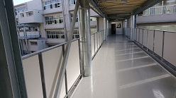 <特別教室棟から教室棟を望む> <教室棟と特別教室棟を結ぶ渡り廊下>