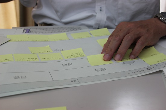 今回のワークはそれぞれの授業改善の課題などを、枠内の内容に沿って付箋に書きだしていくことで、「個人の教育活動の視覚的整理」「自己省察による俯瞰と構造化」を行いました。