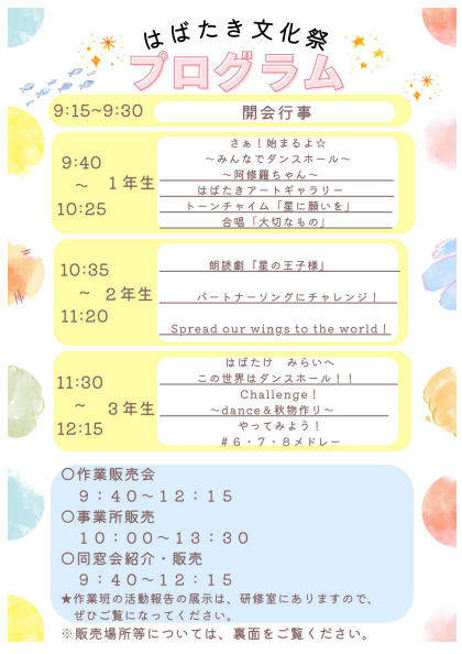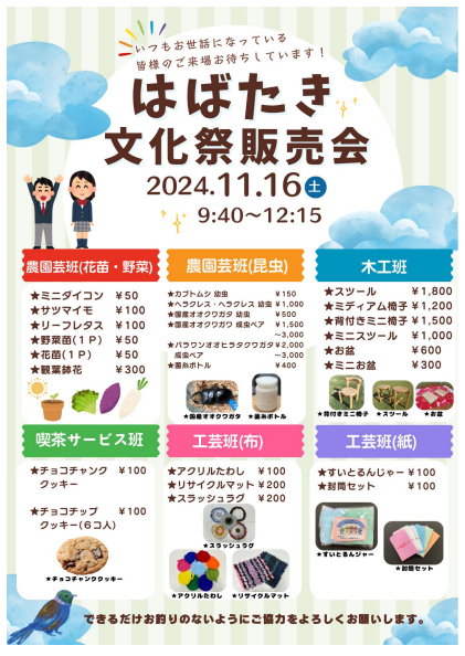 令和6年(2024年)11月16日(土)9:15より「はばたき文化祭」が開かれます。(保護者並びに事業所、地域の方のご来場は9:30より入場可能です。)