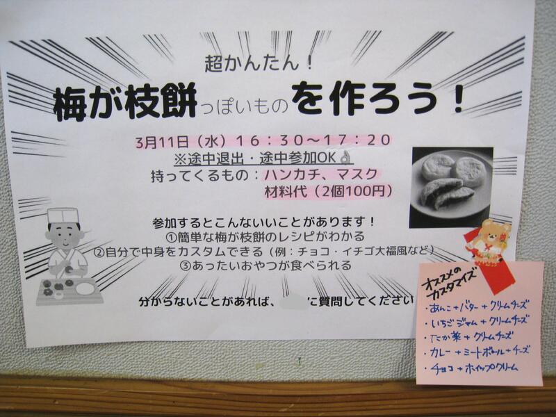 3月11日(水)、この日は、サークル活動「梅ケ枝餅(っぽいもの)を作ろう!」を行いました。