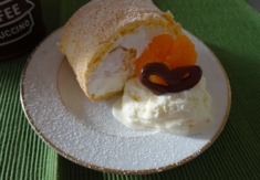 フルーツロールケーキを作りました。生地がふわふわになるように混ぜ方を工夫しました。中に生クリームを入れて、おいしく作れました!