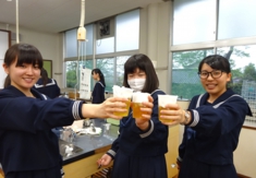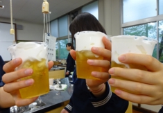 新しく部員が入ってきました!今日はみんなでお祝いにビール風りんごゼリーを作りました。家政部カンパーイ!!