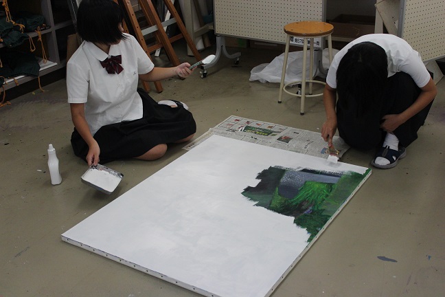 今日は、午後2時から4時まで活動しました。高美展に向けて、まず白絵の具を使って、F50号キャンバスの下塗り作業を行いました。今後は約1か月かけて作品を完成させていきます。その間には、文化祭もあります。文化祭では、絵葉書の作製も行う予定です。来場された方には、プレゼントがあるかもしれません。ぜひお越しください。”芸術の秋”、私たちも忙しい秋となります。