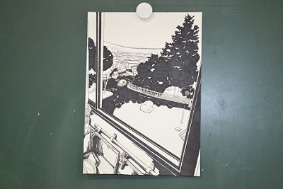 人吉新聞から、依頼を受けて、「校内の好きな風景」を描いています。色をつけるか、モノクロでいくか悩んでいます。景色は、「美術室から見える風景」です。この風景は、部活が終わって、筆や絵の具入れなどを洗っているときに見える風景です。私にとっては、部活終わりの”充実感”を感じることができる風景です。(美術部女子)