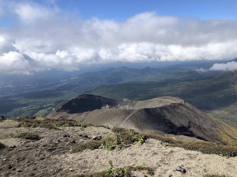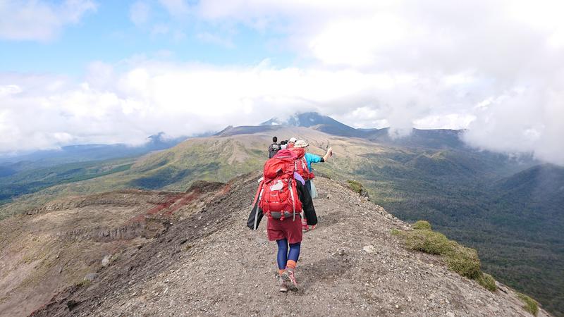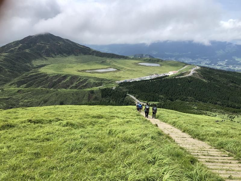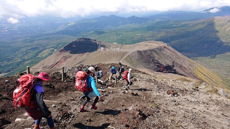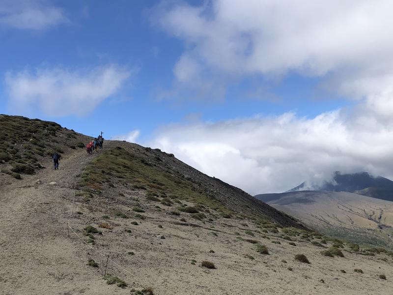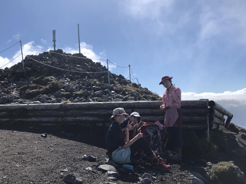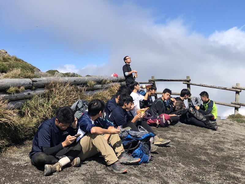 高千穂峰(たかちほのみね)に登ってきました。宮崎県と鹿児島県の県境に位置する火山で、標高は1,574mです。前日の雨からうって変わって好天に恵まれ、最高の登山となりました。 登りこそ、多少霧がかかっていましたが、頂上からは全景が見られて、部員のテンションは上がりました。有名な逆矛も見ました。しっかり頂上に刺さっていました。私たちが登頂した後、ぞくぞくと高校生らしき姿が現れました。尋ねてみると、ラサール高校の1学年全員200名超が登ってくるとのことでした。恒例の学年企画だそうです。その中に大きなザックを背負っている生徒がいたので、尋ねてみると私たちの仲間でした。そう、ラサール高校山岳部員。がんばれ高校山岳部!帰りは、えびのの白鳥温泉に入って疲れを癒やしました。