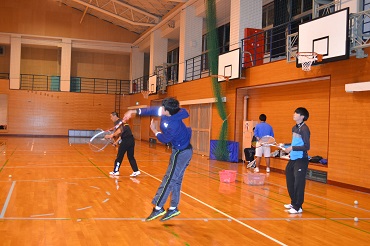 写真は、第2体育館で行っている練習の様子です。この春、人高に入学する生徒の皆さん、一緒にソフトテニスを頑張ってみませんか。お待ちしています。
