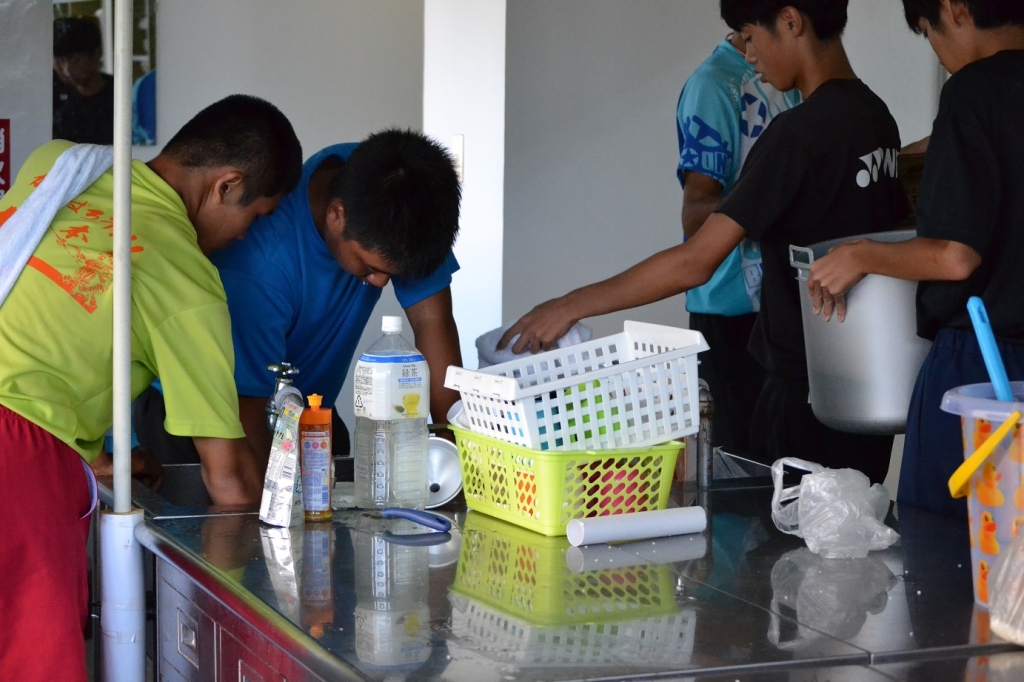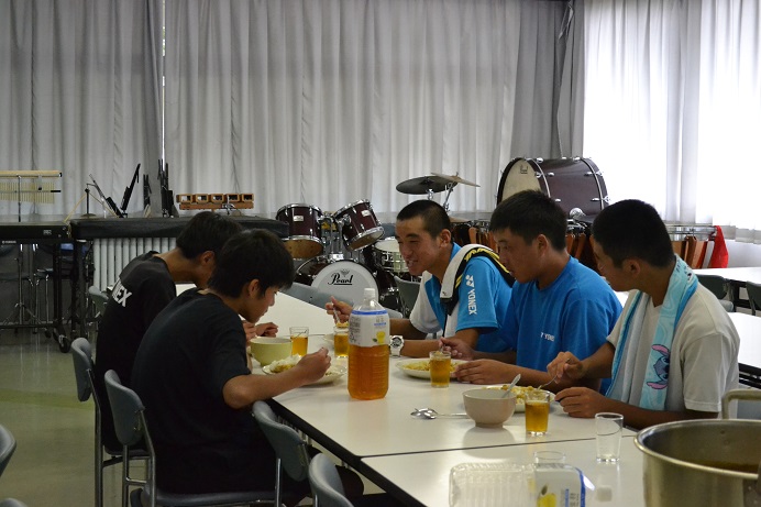 学校のセミナーハウスで、2泊3日の合宿練習を行っています。ソフトテニスの技術練習はもちろんのこと、日頃はやらない食事の準備を行ったり練習着を洗濯したりして、部員たちはセミナハウスの中でも、決められたスケジュールに従って、慌ただしく過ごしています。(夕食は保護者の方にお手伝いして頂きました。有り難うございました)技術力・体力・精神力・人間力などを磨く合宿となっています。