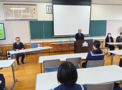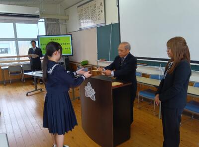 囲碁で全国選抜大会に参加した生徒及び国民スポーツ大会に出場した水泳部の生徒に授与されました。3年生になると参加できる大会も数少なくなってきます。納得のいく結果が得られるよう、日ごろの努力の成果を発揮できるようこれからも頑張ると謝辞で述べてくれました。頑張ってほしいと思います。