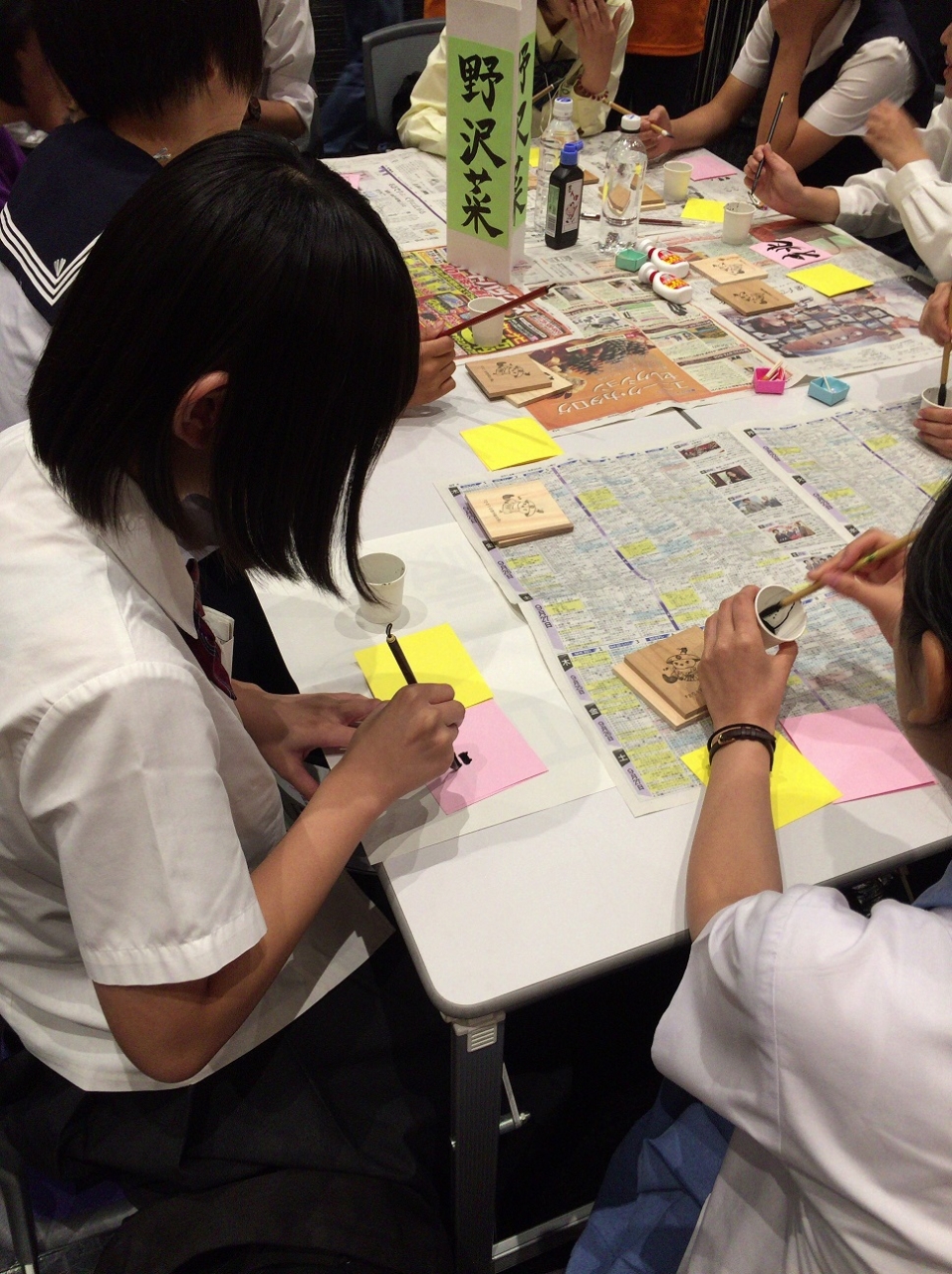 開会式、生徒交流会は、まつもと市民芸術会館で行われました。生徒交流会では、水引きを使ったヘアピンや筆おき、長野県産の木材を使用したコースター制作を体験しました。