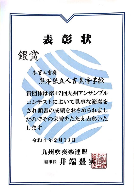 12月13日(日)に行われた『第46回熊本県アンサンブルコンテスト』(於:ウイングまつばせ)において、本校吹奏楽部の打楽器三重奏が『金賞』、金管四重奏が『銀賞』を受賞しました。