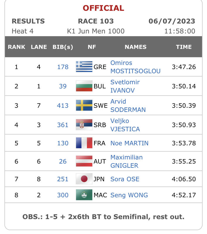 【カヌー部・大瀬空 ジュニア世界選手権大会の情報(大会2日目カヤックシングル1000mの結果報告)】