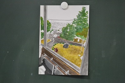 人吉新聞から、依頼を受けて、「校内の好きな風景」を描いています。色をつけるか、モノクロでいくか悩んでいます。景色は、「美術室から見える風景」です。この風景は、部活が終わって、筆や絵の具入れなどを洗っているときに見える風景です。私にとっては、部活終わりの”充実感”を感じることができる風景です。(美術部女子)