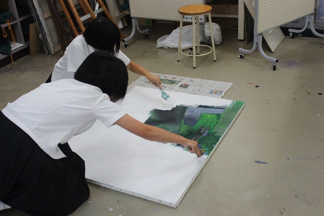 今日は、午後2時から4時まで活動しました。高美展に向けて、まず白絵の具を使って、F50号キャンバスの下塗り作業を行いました。今後は約1か月かけて作品を完成させていきます。その間には、文化祭もあります。文化祭では、絵葉書の作製も行う予定です。来場された方には、プレゼントがあるかもしれません。ぜひお越しください。”芸術の秋”、私たちも忙しい秋となります。