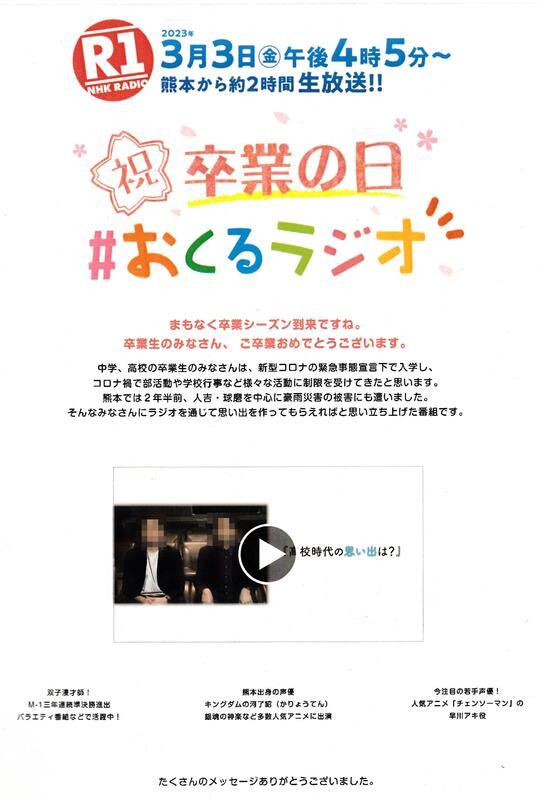 3月3日(金)16:05~「祝卒業の日♯おくるラジオ」に部員2名が生出演しました。