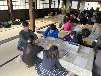 熊本大学教育学部の松永先生にアドバイスをいただきながら、子どもたちと一緒にてがみ絵を作成しました。