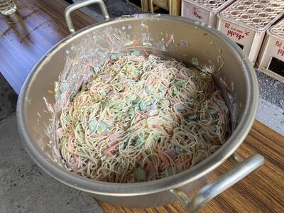 テイクアウトランチは三色丼とサラダスパゲッティでした。