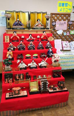 その昔、一般家庭から寄贈された立派な7段飾りで、図書館も一気に華やぎます。