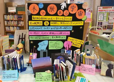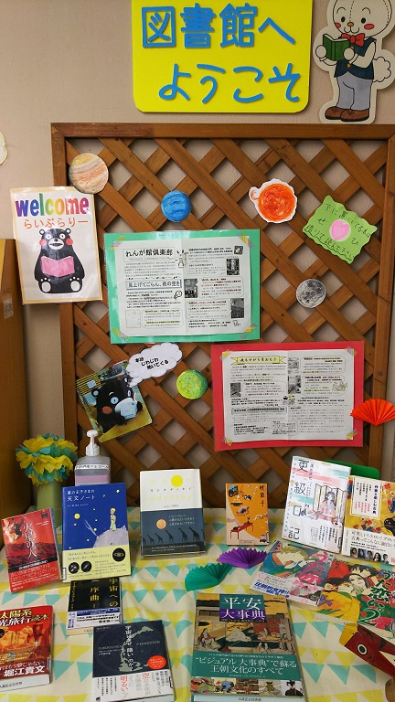 図書館に入ってすぐの正面に、『れんが館倶楽部』と紹介した本を一緒に展示しています。生徒力作の「惑星」のイラスト飾りも!